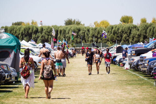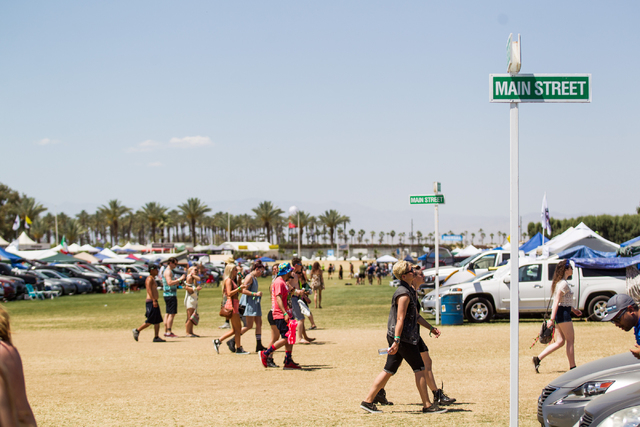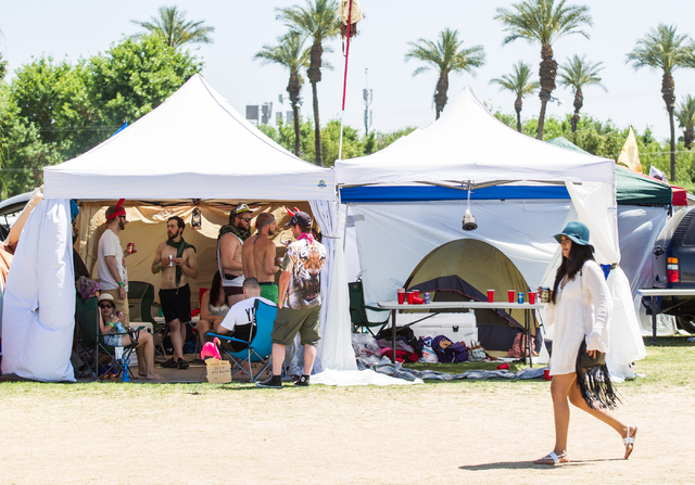Attendees walk in a campground area during the second weekend of Coachella Valley Music & Arts Festival at the Empire Polo Club on Saturday, April 18, 2015 in Indio, Calif. (Chase Stevens/Las Vegas Review-Journal) Follow Chase Stevens on Twitter at @csstevensphoto