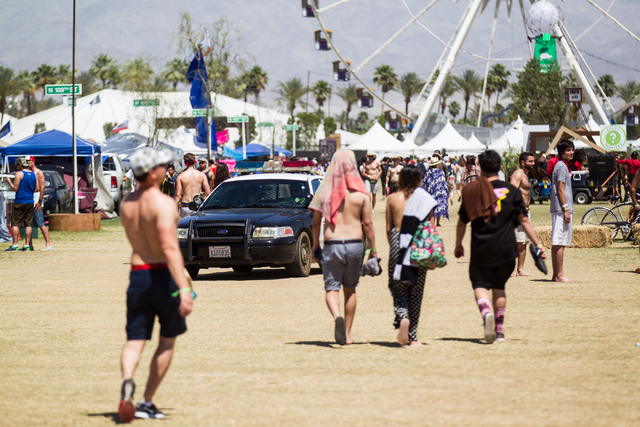 A police car is seen as attendees walk in a campground area during the second weekend of Coachella Valley Music & Arts Festival at the Empire Polo Club on Saturday, April 18, 2015 in Indio, Calif. (Chase Stevens/Las Vegas Review-Journal) Follow Chase Stevens on Twitter at @csstevensphoto