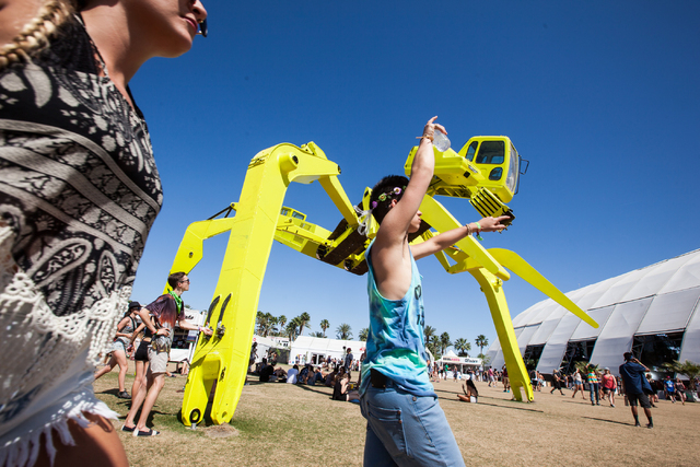 Attendees walk by EarthMover, an art installation by Christian Ristow, during the second weekend of Coachella Valley Music & Arts Festival at the Empire Polo Club on Saturday, April 18, 2015 in Indio, Calif. (Chase Stevens/Las Vegas Review-Journal) Follow Chase Stevens on Twitter at @csstevensphoto