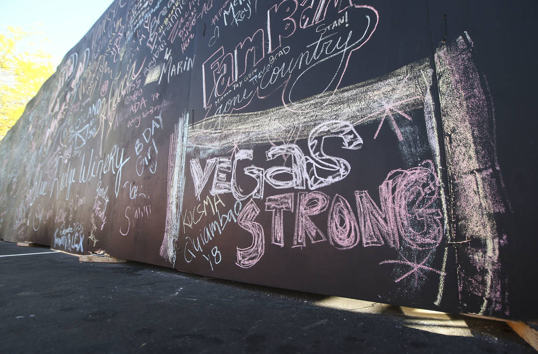 “We can’t let people scare us away from what we love,” said Las Vegas resident Angie Boudreaux, whose purse was adorned with Vegas Strong items. “We’re not afraid.”
