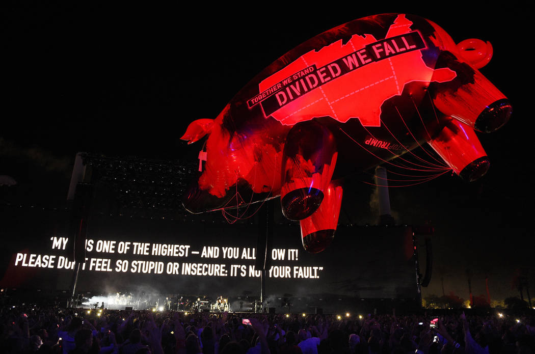 But like “The Wall” tour, which Evans also worked on with the 73-year-old British rocker, old symbols take on new meaning. The flying pig now carries a cartoon image of Donald Trump with the word balloon “I won!”