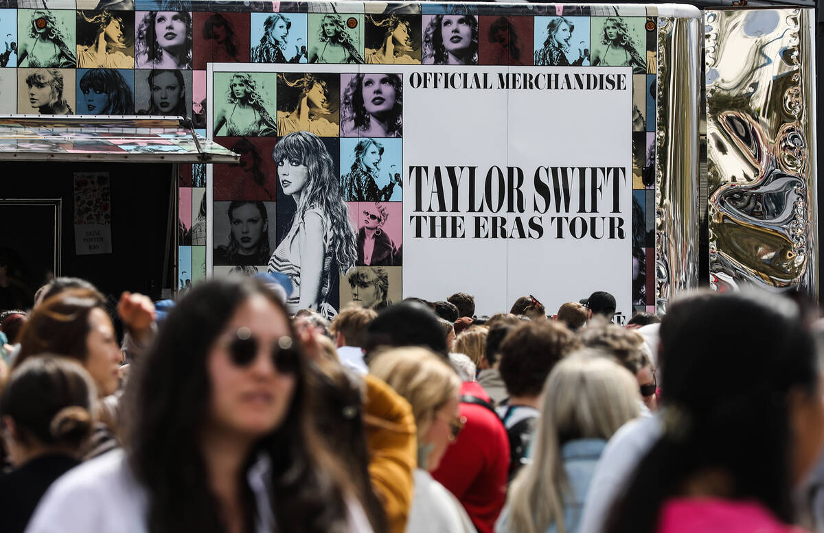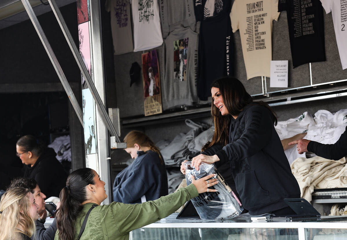 A fan buys Taylor Swift merchandise at a pop-up store outside Allegiant Stadium in Las Vegas, Thursday, March 23, 2023. Swift is playing Friday and Saturday night at Allegiant Stadium as part of her Eras Tour. (Rachel Aston/Las Vegas Review-Journal) @rookie__rae