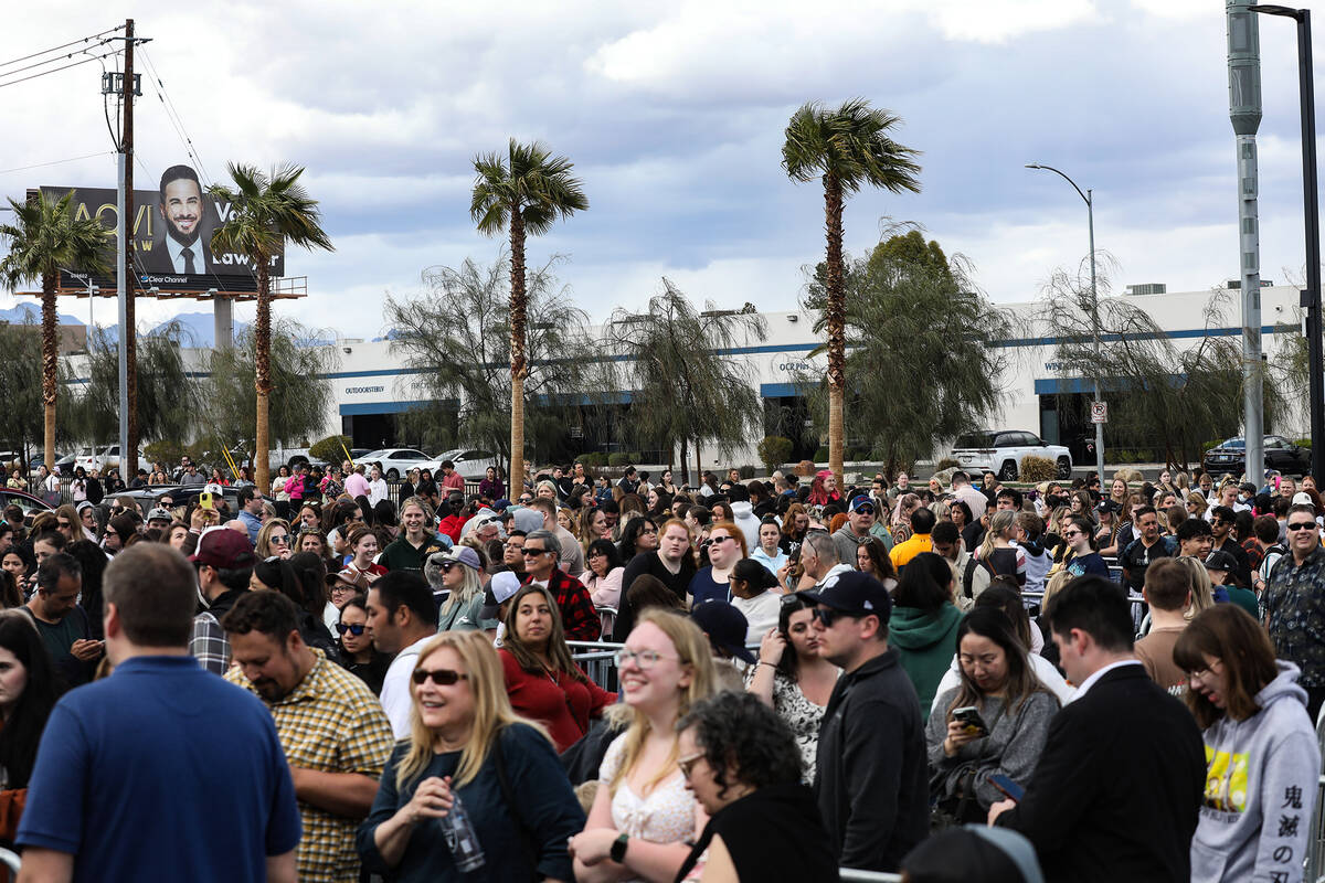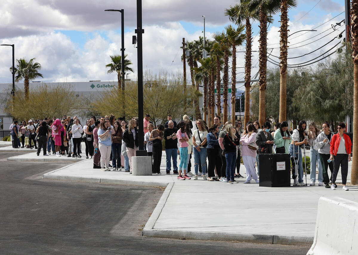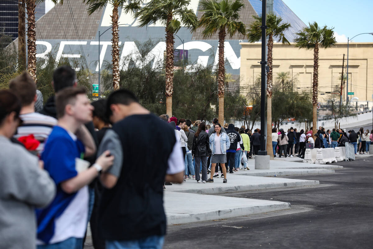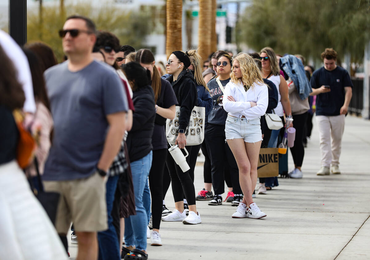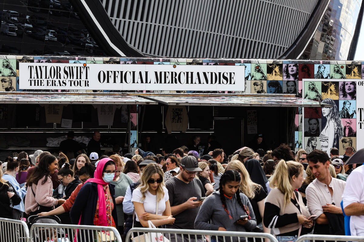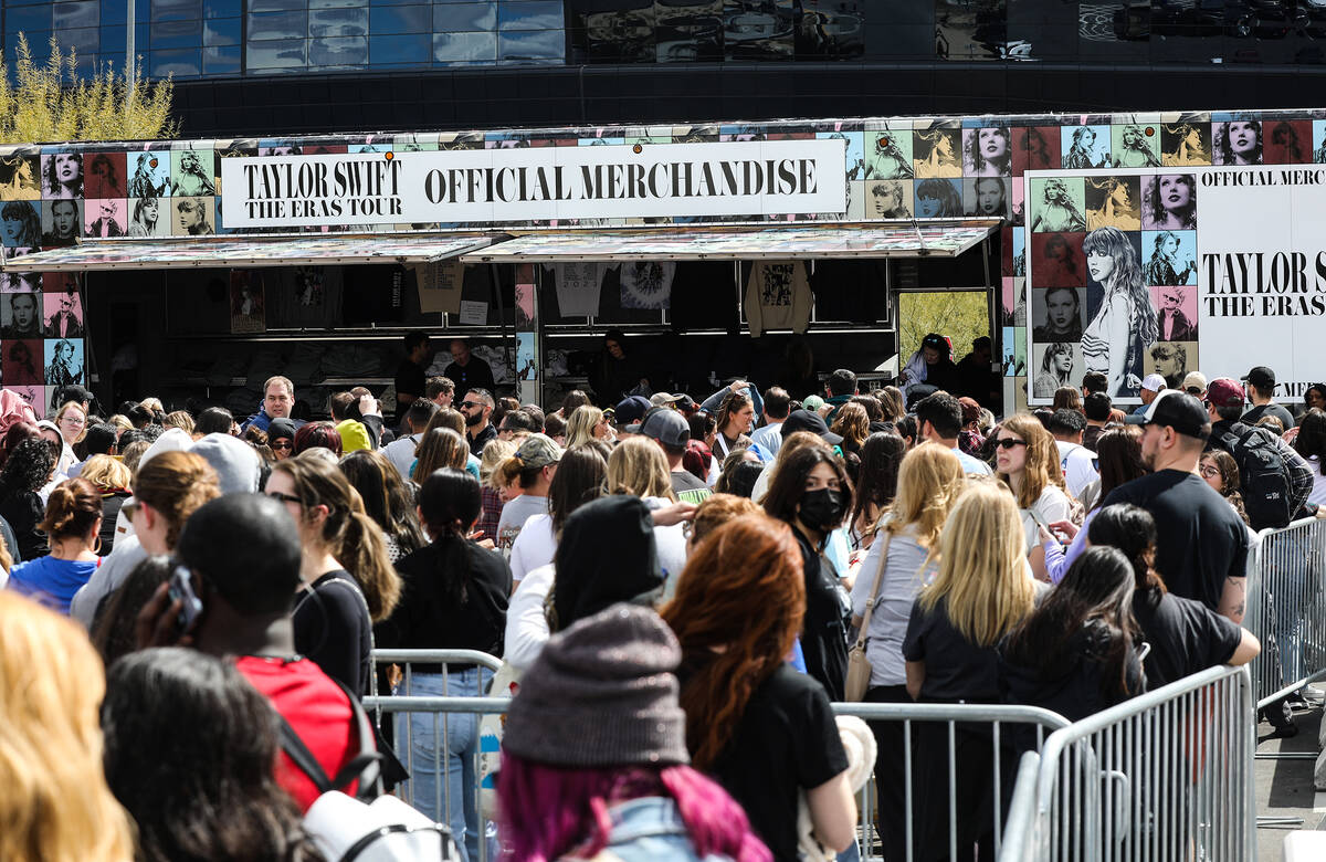 Fans wait in line for Taylor Swift merchandise at a pop-up store outside Allegiant Stadium in Las Vegas, Thursday, March 23, 2023. Swift is playing Friday and Saturday night at Allegiant Stadium as part of her Eras Tour. (Rachel Aston/Las Vegas Review-Journal) @rookie__rae