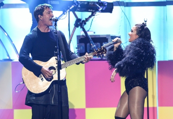 Demi Lovato, right performs with Stephan Jenkins of Third Eye Blind during the iHeartRadio Music Festival at the MGM Grand Garden Arena in Las Vegas on Friday, Sept. 18, 2015. Chase Stevens/Las Vegas Review-Journal Follow @csstevensphoto