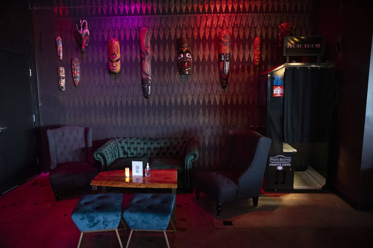 Ornate wooden tiki masks hang near a trio of quasi-cubist paintings based on Coen Brothers films, including a particularly sweet portrait of The Dude from “The Big Lebowski.” Triangular mirrors, a menagerie of love seats and plush chairs, turquoise- and sea foam-colored walls and, of course, a photo booth round out the decor.