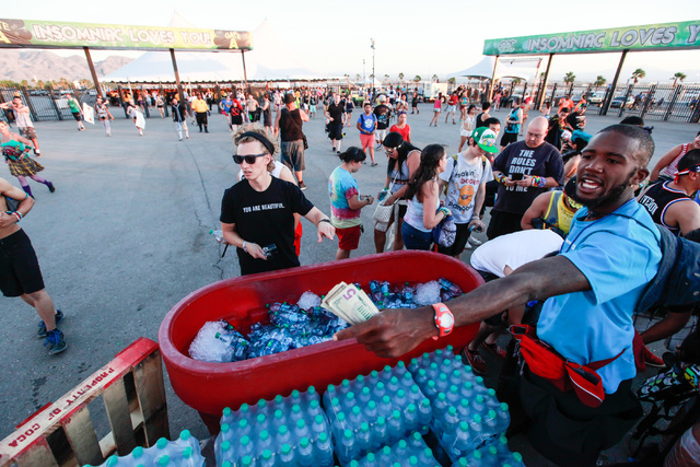 A salesman yells at a man stealing a water bottle as attendees enter the gates at Electric Daisy Carnival at the Las Vegas Motor Speedway in Las Vegas on Sunday, June 21, 2015. (Chase Stevens/Las Vegas Review-Journal) Follow Chase Stevens on Twitter @csstevensphoto
