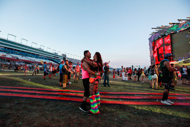 Patrick Crawley and Brittany Seidel, right, share a kiss as fireworks go off at Electric Daisy Carnival at the Las Vegas Motor Speedway in Las Vegas during the early hours of Monday, June 22, 2015. (Chase Stevens/Las Vegas Review-Journal) Follow Chase Stevens on Twitter @csstevensphoto