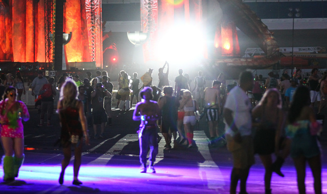 Attendees walk the festival grounds as the sun rises at Electric Daisy Carnival at the Las Vegas Motor Speedway in Las Vegas on Monday, June 22, 2015. (Chase Stevens/Las Vegas Review-Journal) Follow Chase Stevens on Twitter @csstevensphoto