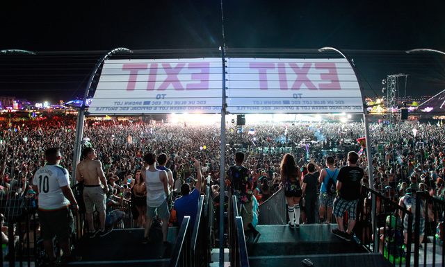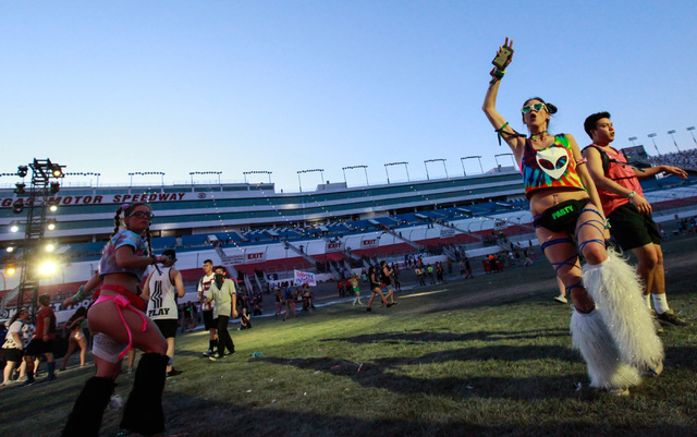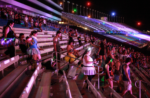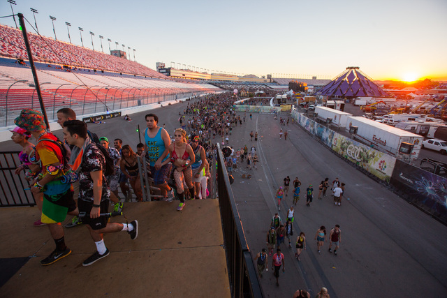 Attendees make their through the grandstands to the festival grounds at Electric Daisy Carnival at the Las Vegas Motor Speedway in Las Vegas on Sunday, June 21, 2015. (Chase Stevens/Las Vegas Review-Journal) Follow Chase Stevens on Twitter @csstevensphoto