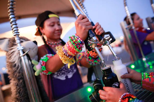 Attendees get their waters filled at the Cosmic Meadow stage at Electric Daisy Carnival at the Las Vegas Motor Speedway in Las Vegas on Sunday, June 21, 2015. (Chase Stevens/Las Vegas Review-Journal) Follow Chase Stevens on Twitter @csstevensphoto