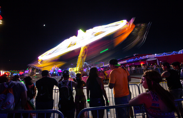 Attendees line up for a carnival ride at Electric Daisy Carnival at the Las Vegas Motor Speedway in Las Vegas on Sunday, June 21, 2015. (Chase Stevens/Las Vegas Review-Journal) Follow Chase Stevens on Twitter @csstevensphoto