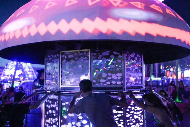 Attendees interact with the Caterpillar's Garden art installation at Electric Daisy Carnival at the Las Vegas Motor Speedway in Las Vegas on Sunday, June 21, 2015. (Chase Stevens/Las Vegas Review-Journal) Follow Chase Stevens on Twitter @csstevensphoto