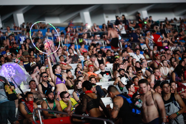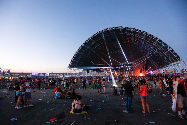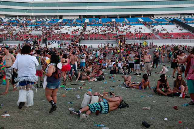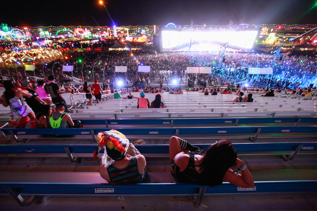 Attendees relax in the grandstands at Electric Daisy Carnival at the Las Vegas Motor Speedway in Las Vegas during the early hours of Monday, June 22, 2015. (Chase Stevens/Las Vegas Review-Journal) Follow Chase Stevens on Twitter @csstevensphoto