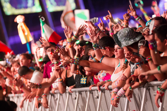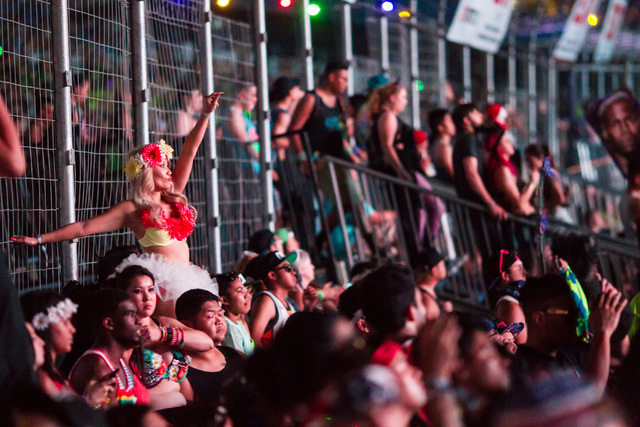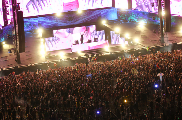 Attendees watch as Tiesto performs at the Kinetic Field stage at Electric Daisy Carnival at the Las Vegas Motor Speedway in Las Vegas during the early hours of Monday, June 22, 2015. (Chase Stevens/Las Vegas Review-Journal) Follow Chase Stevens on Twitter @csstevensphoto