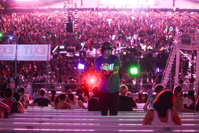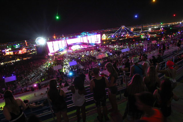 Attendees observe the festival grounds from the grandstands at Electric Daisy Carnival at the Las Vegas Motor Speedway in Las Vegas on Sunday, June 21, 2015. (Chase Stevens/Las Vegas Review-Journal) Follow Chase Stevens on Twitter @csstevensphoto