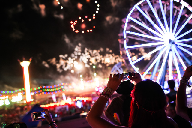 Attendees record the fireworks at Electric Daisy Carnival at the Las Vegas Motor Speedway in Las Vegas during the early hours of Monday, June 22, 2015. (Chase Stevens/Las Vegas Review-Journal) Follow Chase Stevens on Twitter @csstevensphoto