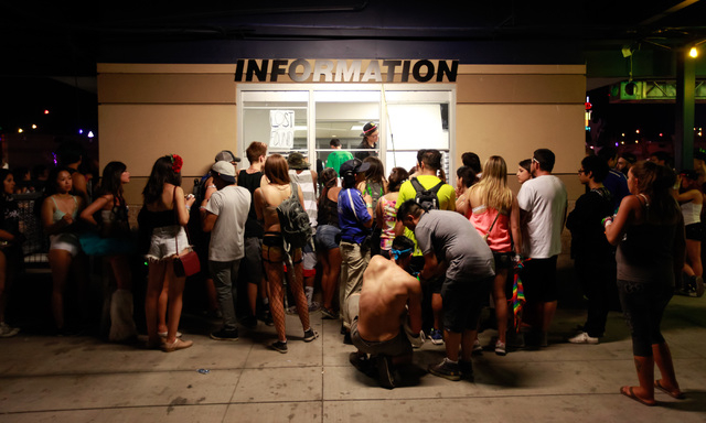 People line up at the lost and found area at Electric Daisy Carnival at the Las Vegas Motor Speedway in Las Vegas during the early hours of Monday, June 22, 2015. (Chase Stevens/Las Vegas Review-Journal) Follow Chase Stevens on Twitter @csstevensphoto