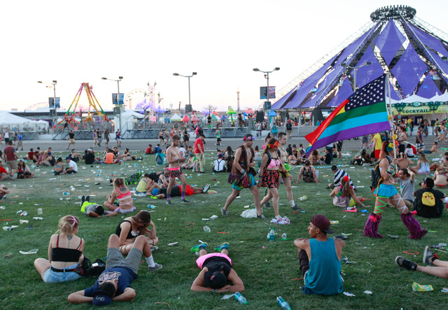 Attendees sit down near the Kinetic Field stage at Electric Daisy Carnival at the Las Vegas Motor Speedway in Las Vegas on Sunday, June 21, 2015. (Chase Stevens/Las Vegas Review-Journal) Follow Chase Stevens on Twitter @csstevensphoto