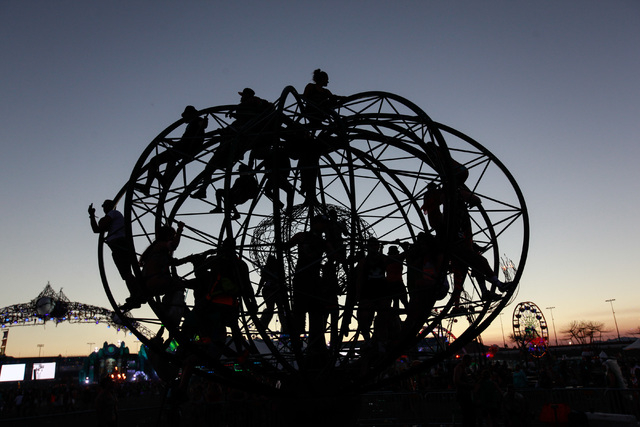 Attendees interact with the ePod art installation as the sun rises at Electric Daisy Carnival at the Las Vegas Motor Speedway in Las Vegas on Monday, June 22, 2015. (Chase Stevens/Las Vegas Review-Journal) Follow Chase Stevens on Twitter @csstevensphoto