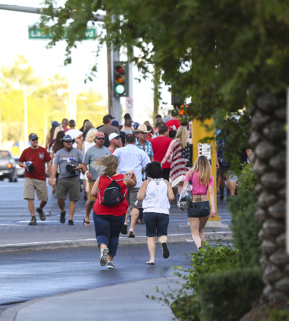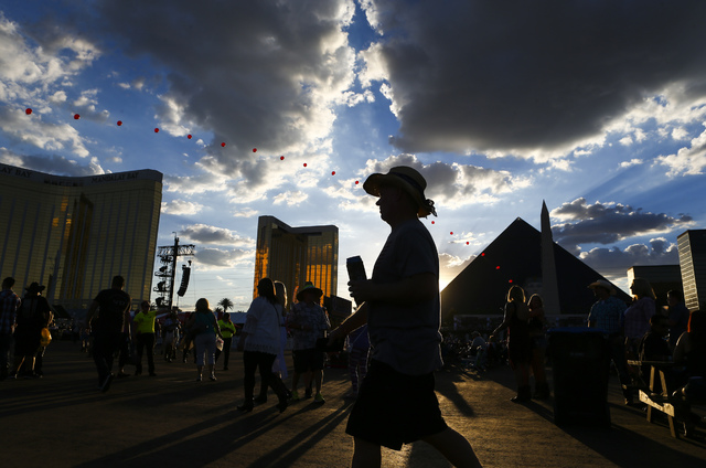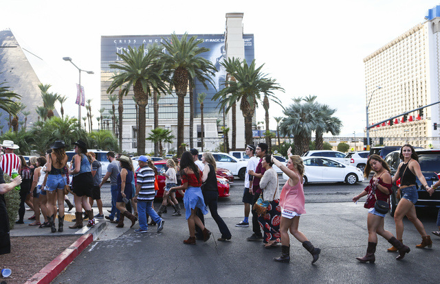 People make their way to the MGM Resorts Village festival site for the Route 91 Harvest country music festival in Las Vegas on Friday, Sept. 30, 2016. Chase Stevens/Las Vegas Review-Journal Follow @csstevensphoto