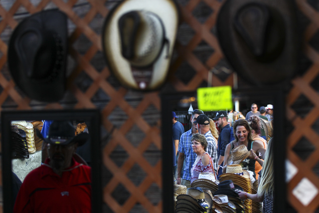 Attendees browse through cowboy hats during the Route 91 Harvest country music festival at the MGM Resorts Village festival site in Las Vegas on Friday, Sept. 30, 2016. Chase Stevens/Las Vegas Review-Journal Follow @csstevensphoto