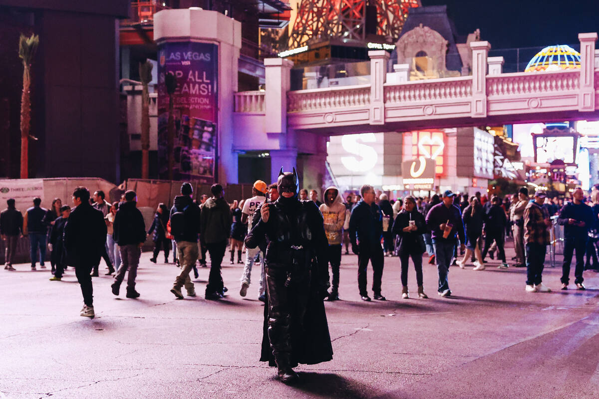 A busker dressed as Batman walks around the Strip on Sunday, Dec. 31, 2023, in Las Vegas. (Madeline Carter/Las Vegas Review-Journal)