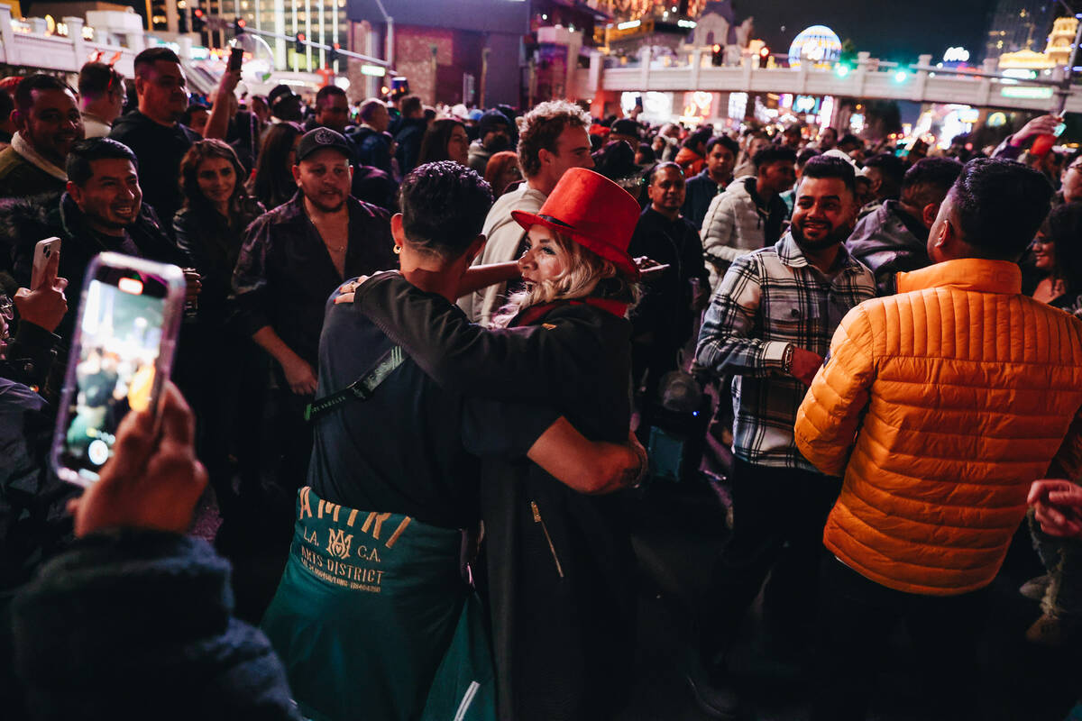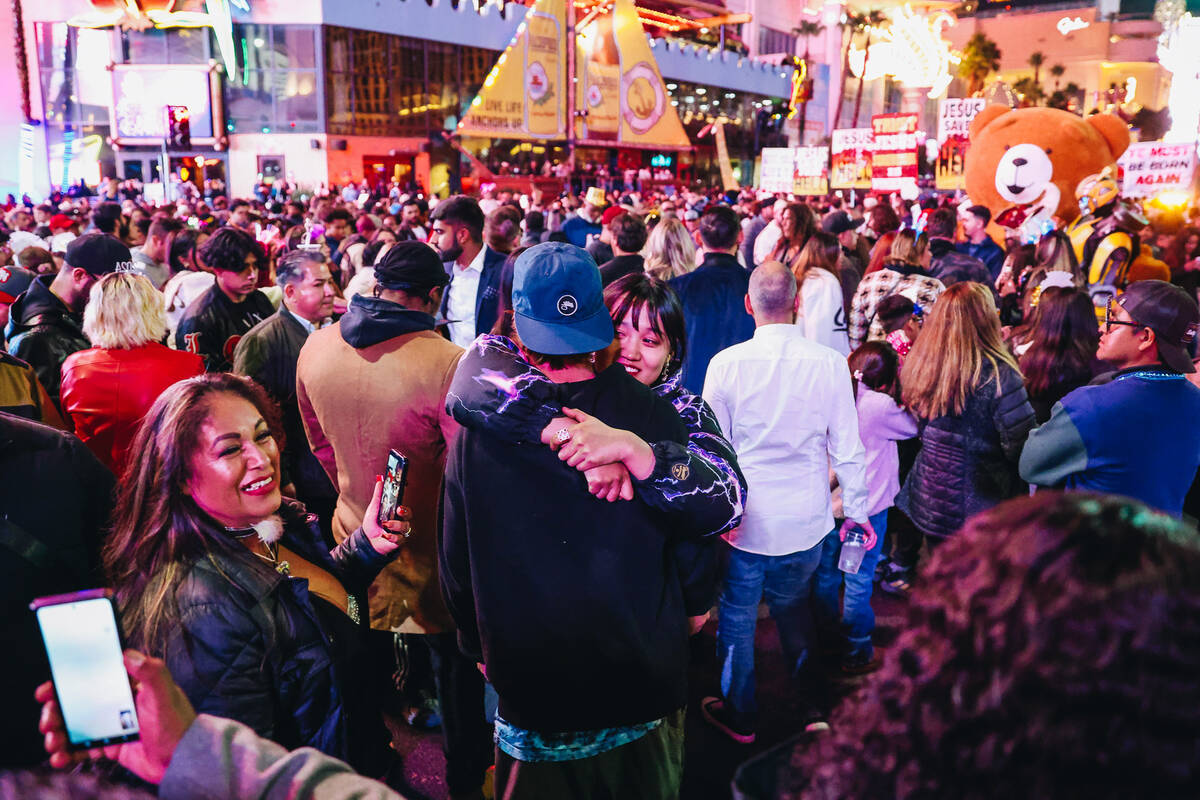 A couple hugs as crowds form on the Strip shortly before midnight on Sunday, Dec. 31, 2023, in Las Vegas. (Madeline Carter/Las Vegas Review-Journal)