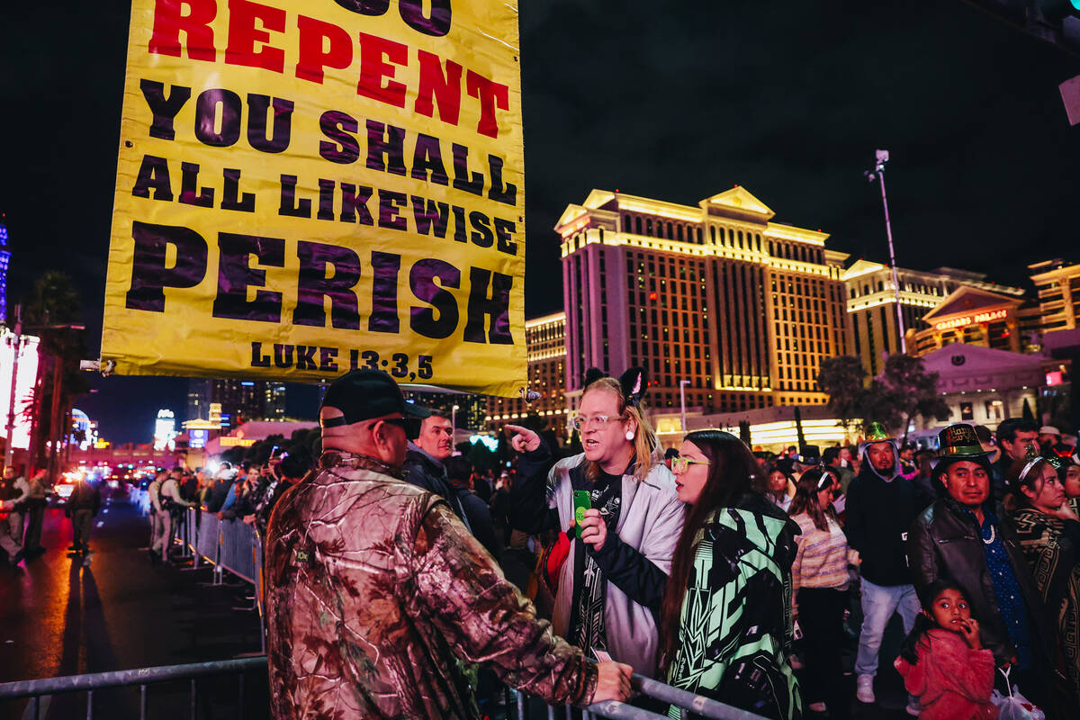 Religious demonstrators occupy part of the Strip during New Year’s Eve celebrations on Sunday, Dec. 31, 2023, in Las Vegas. (Madeline Carter/Las Vegas Review-Journal)
