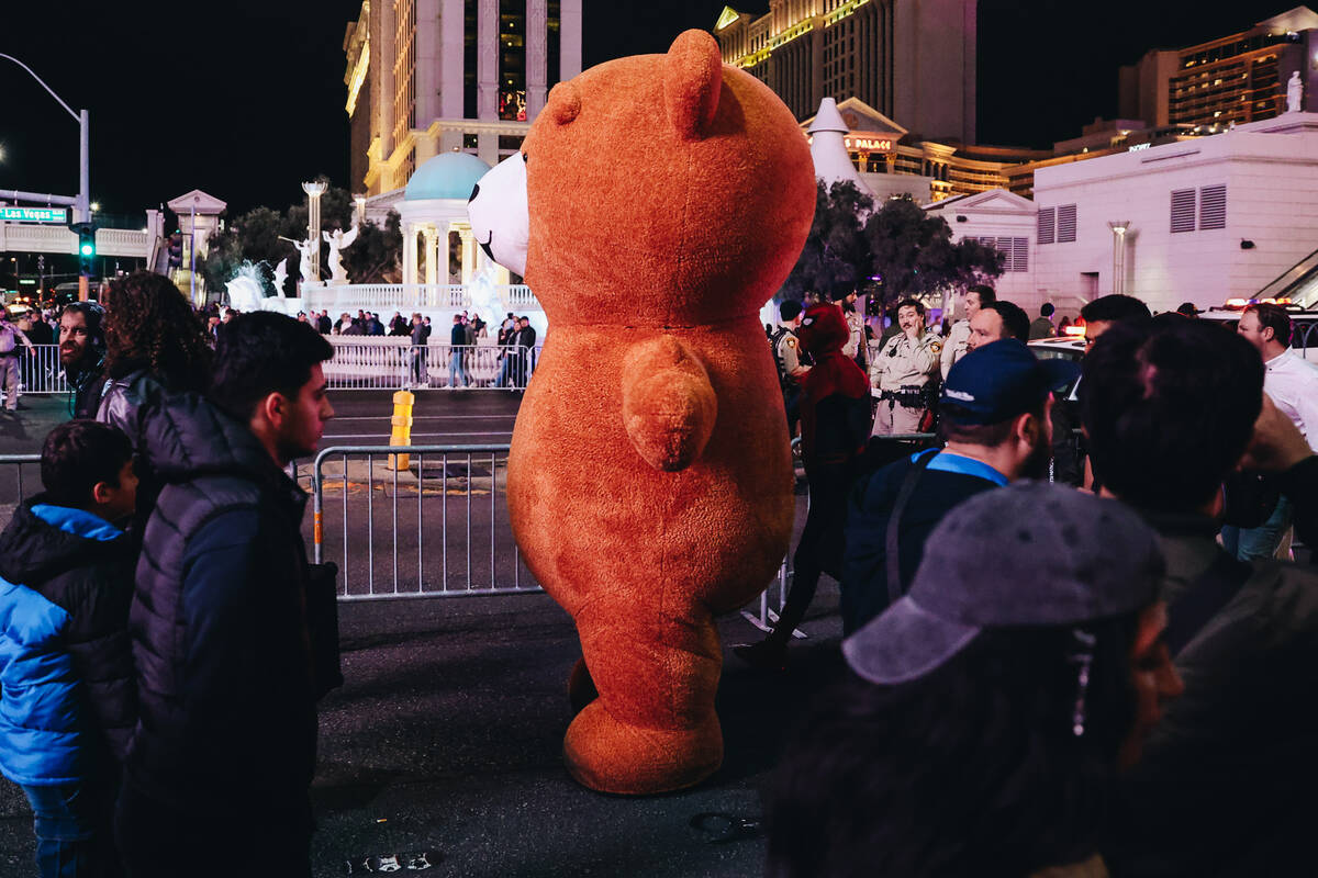 A giant teddy bear was past pedestrians on Sunday, Dec. 31, 2023, in Las Vegas. (Madeline Carter/Las Vegas Review-Journal)