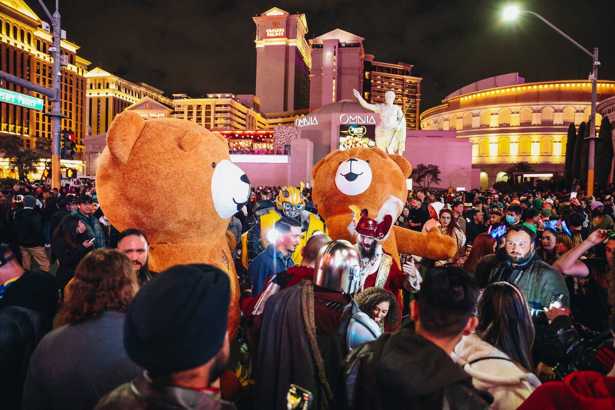 Character buskers gather in the streets after they were closed off for pedestrians to enjoy New Year’s Eve celebrations on Sunday, Dec. 31, 2023, in Las Vegas. (Madeline Carter/Las Vegas Review-Journal)