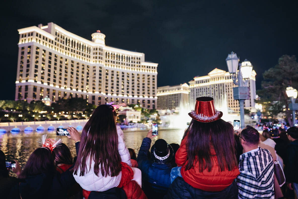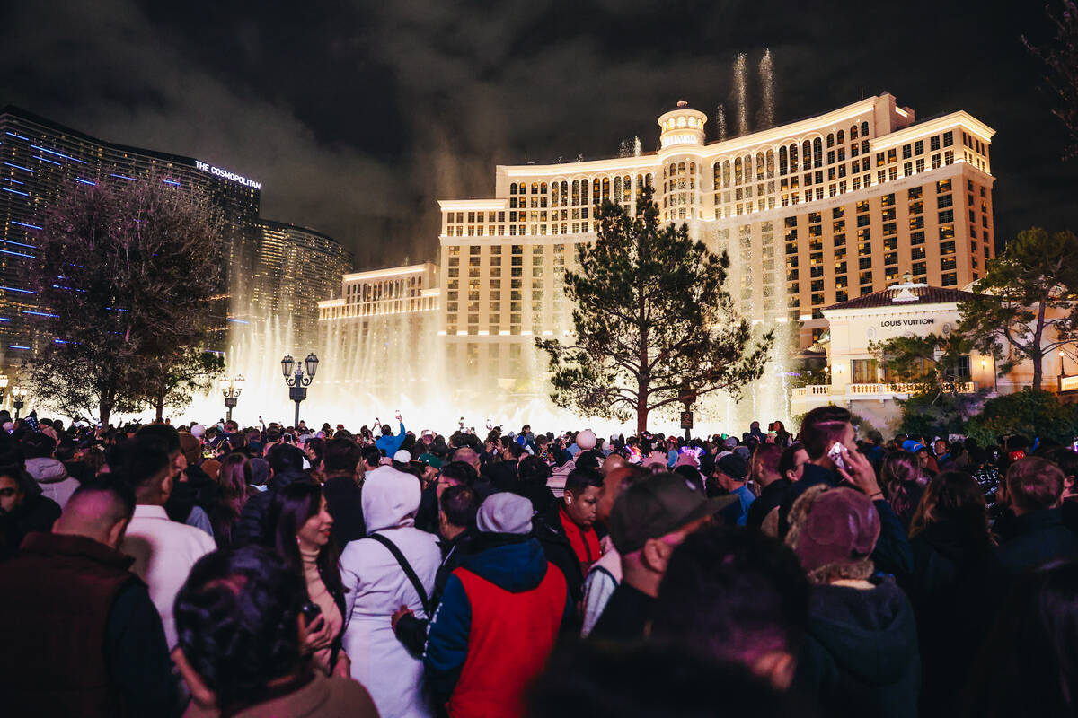 Crowds gather in front of the Fountains of Bellagio shortly before midnight on Sunday, Dec. 31, 2023, in Las Vegas. (Madeline Carter/Las Vegas Review-Journal)