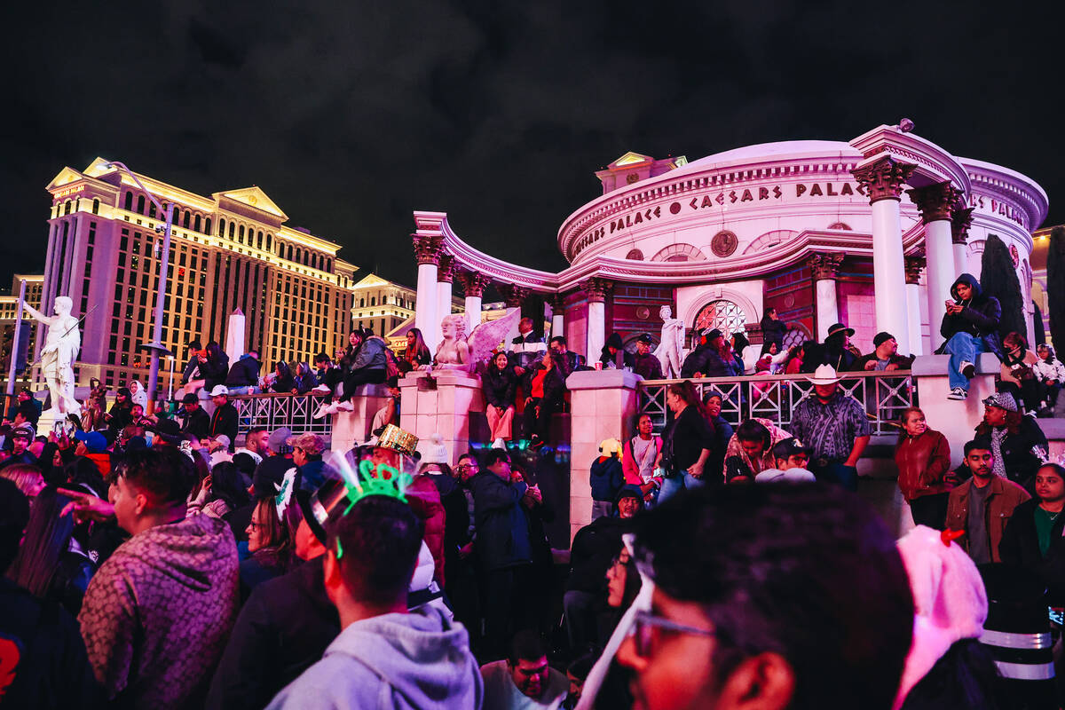 Crowds of people line the Strip in front of Caesars Palace for New Year celebrations on Sunday, Dec. 31, 2023, in Las Vegas. (Madeline Carter/Las Vegas Review-Journal)