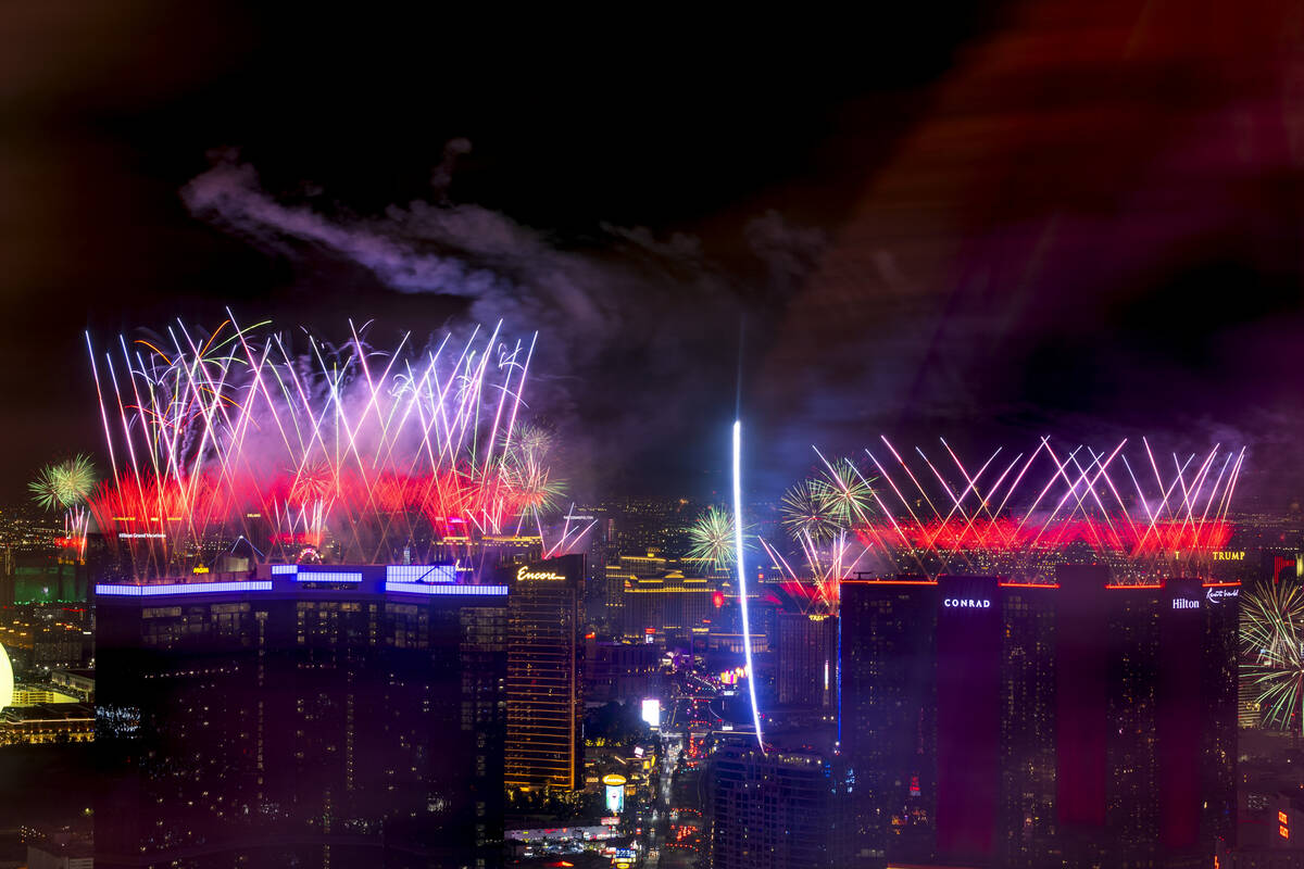 Fireworks erupt over the Las Vegas Strip as part of New Years Eve festivities across the city from atop of the Strat tower on Monday, Jan. 1, 2024, in Las Vegas. (L.E. Baskow/Las Vegas Review-Journal) @Left_Eye_Images