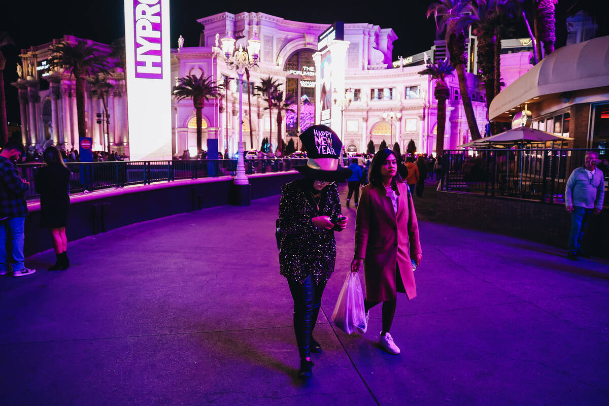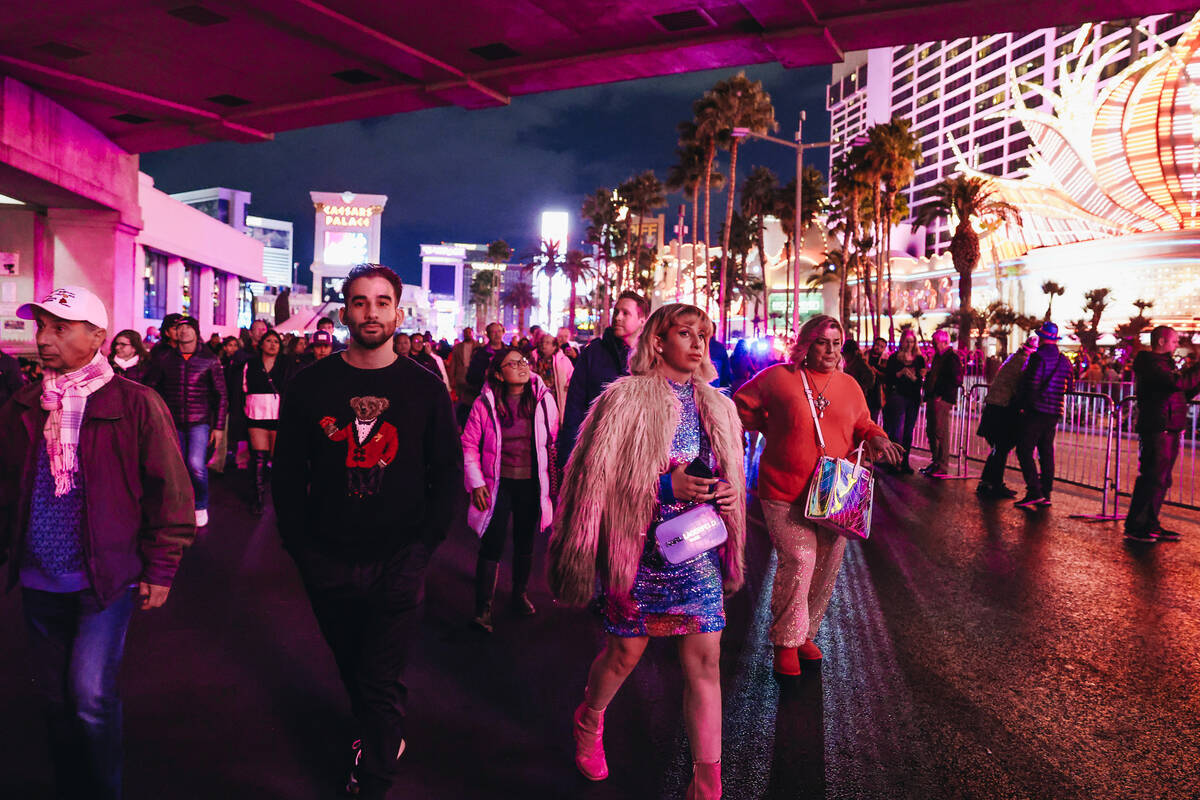 New Year’s revelers walks the Strip on Sunday, Dec. 31, 2023, in Las Vegas. (Madeline Carter/Las Vegas Review-Journal)