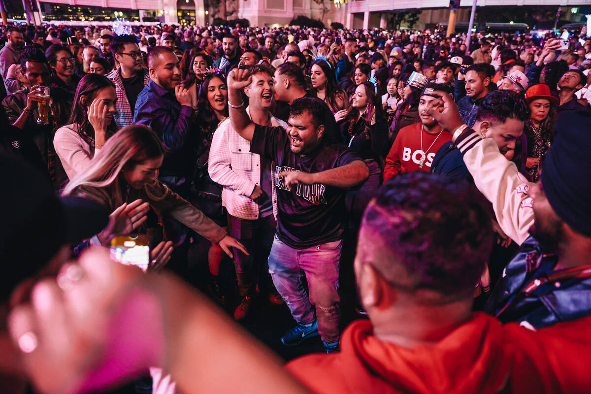 New Year revelers dance in front of Harrah’s on Sunday, Dec. 31, 2023, in Las Vegas. (Madeline Carter/Las Vegas Review-Journal)
