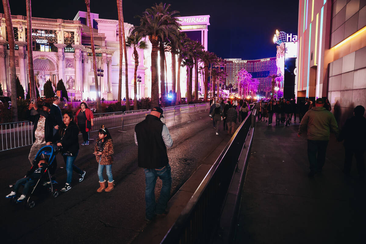 People walk throughout the streets on the Strip after they were closed off for New Year’s Eve celebrations on Sunday, Dec. 31, 2023, in Las Vegas. (Madeline Carter/Las Vegas Review-Journal)