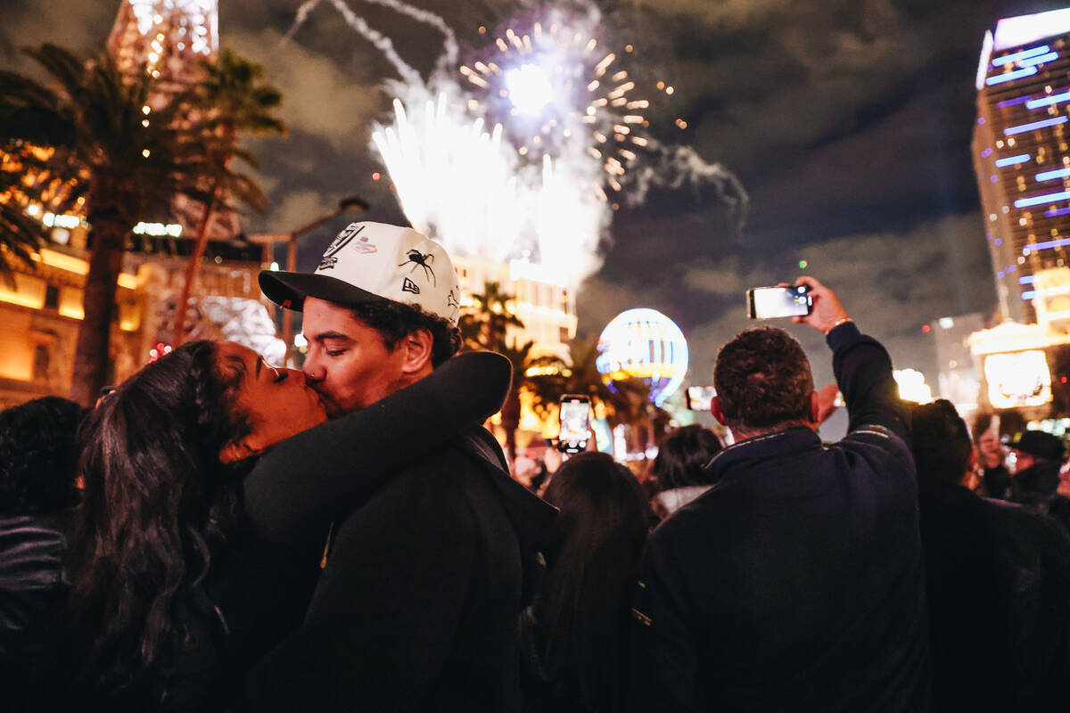A couple kisses at midnight while New Years fireworks go off on the Strip on Monday, Jan. 1, 2024, in Las Vegas. (Madeline Carter/Las Vegas Review-Journal)