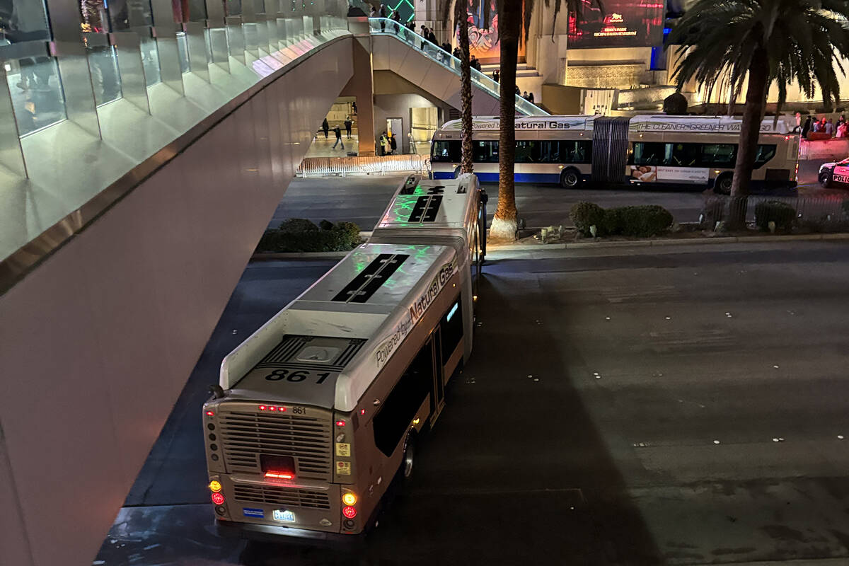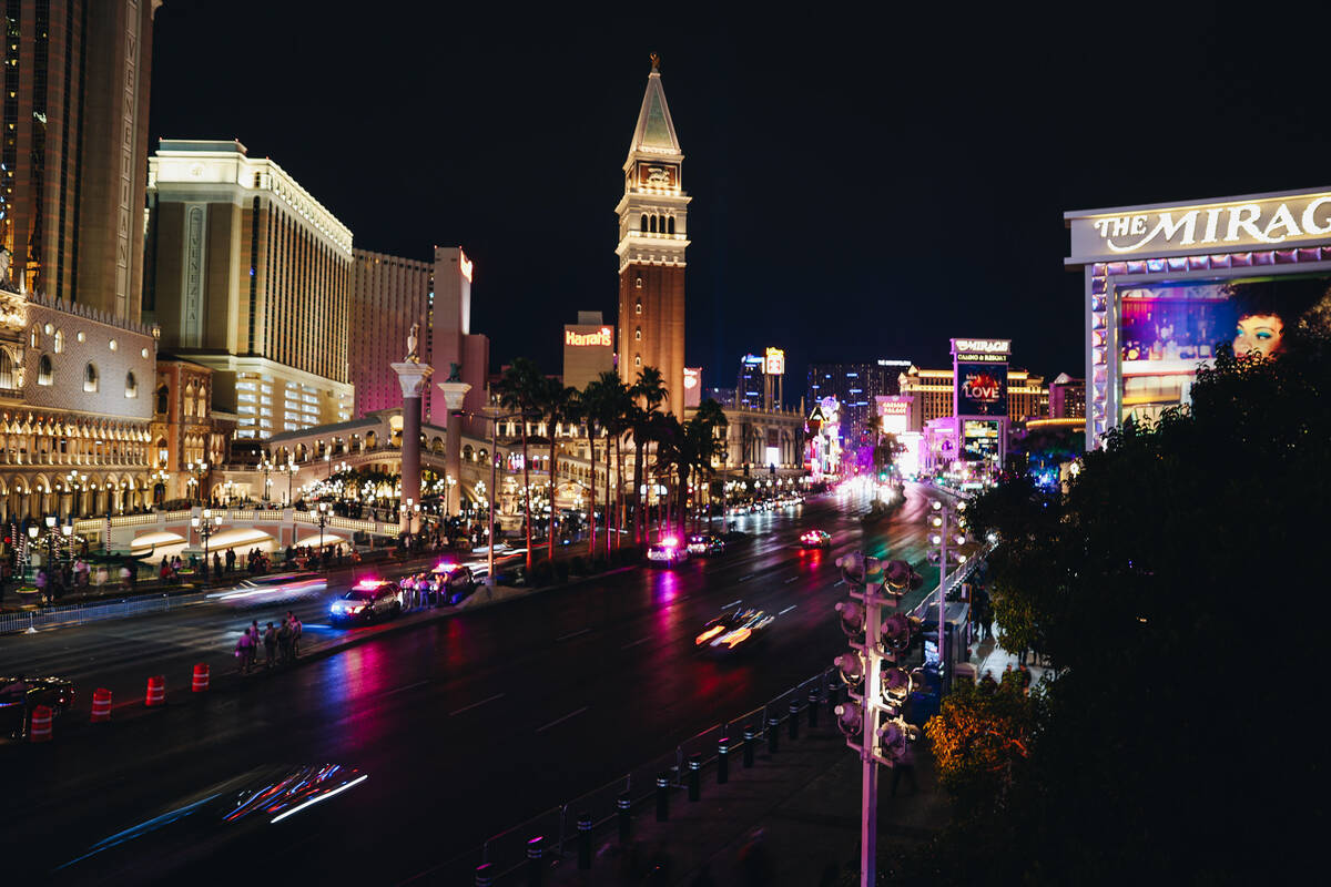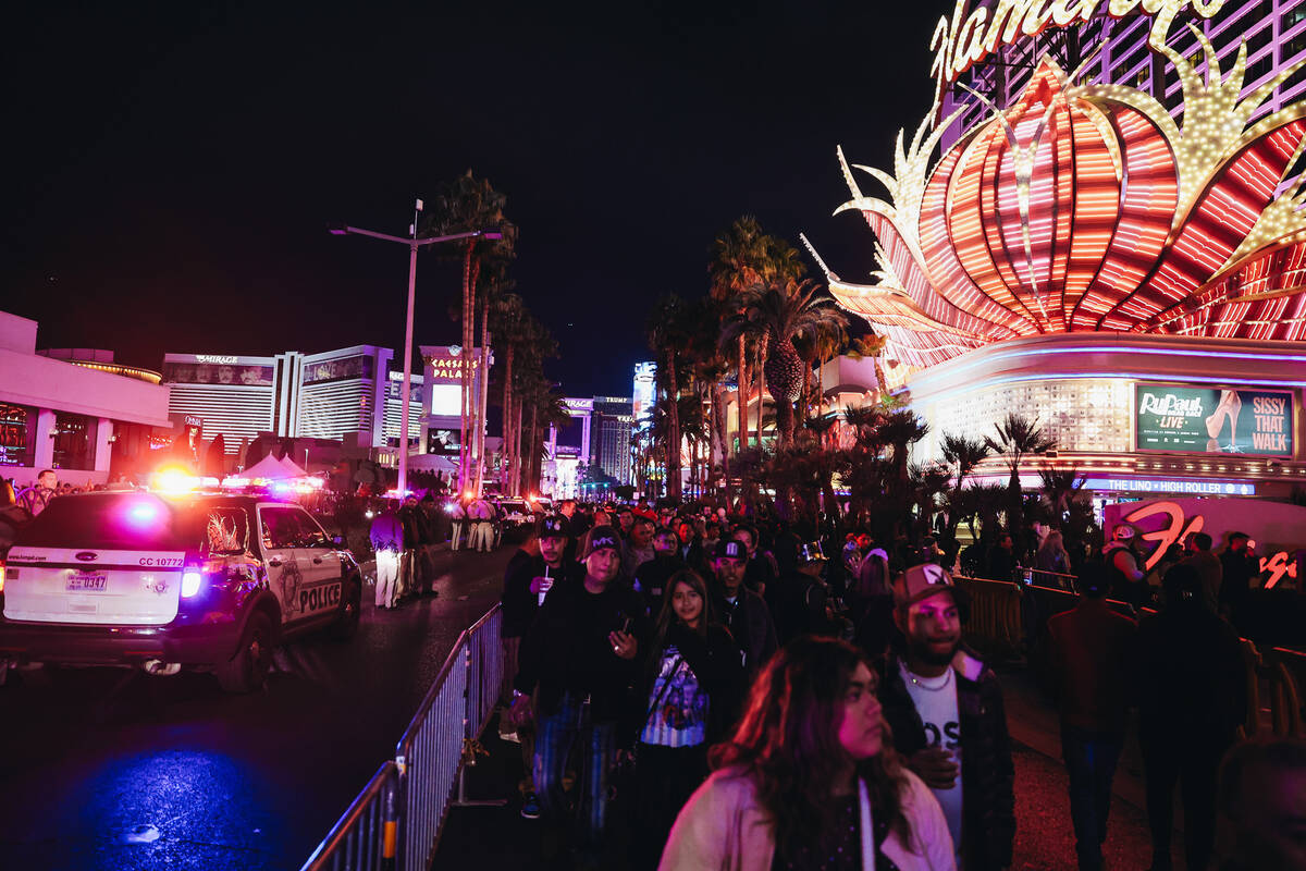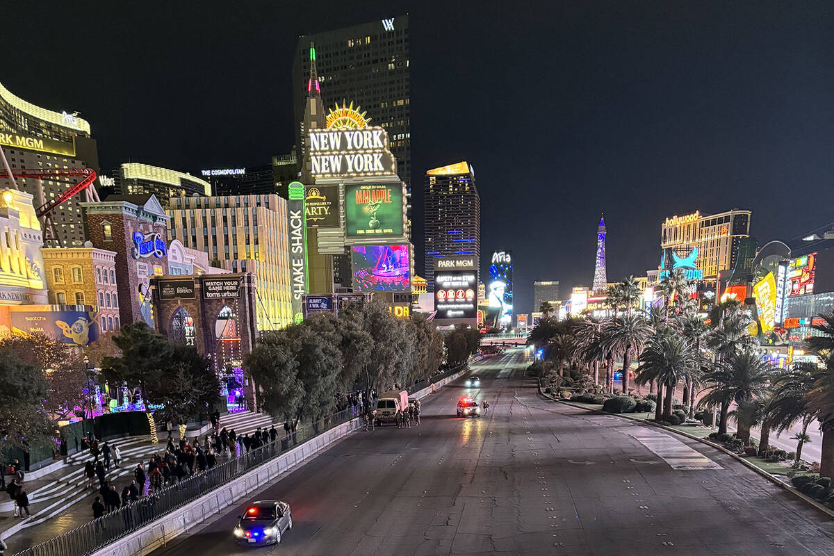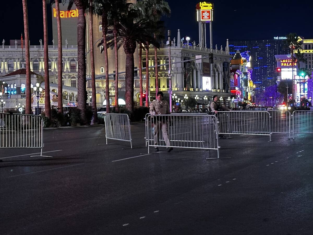 Las Vegas Boulevard and its surrounding roads are a parking lot for law enforcement vehicles with flashing sirens. A group of Nevada National Guard soldiers was spotted circled around Metro officers. As is customary at every year’s celebration, security appears tight as multiple law enforcement agencies work to keep an eye on the thousands of revelers.