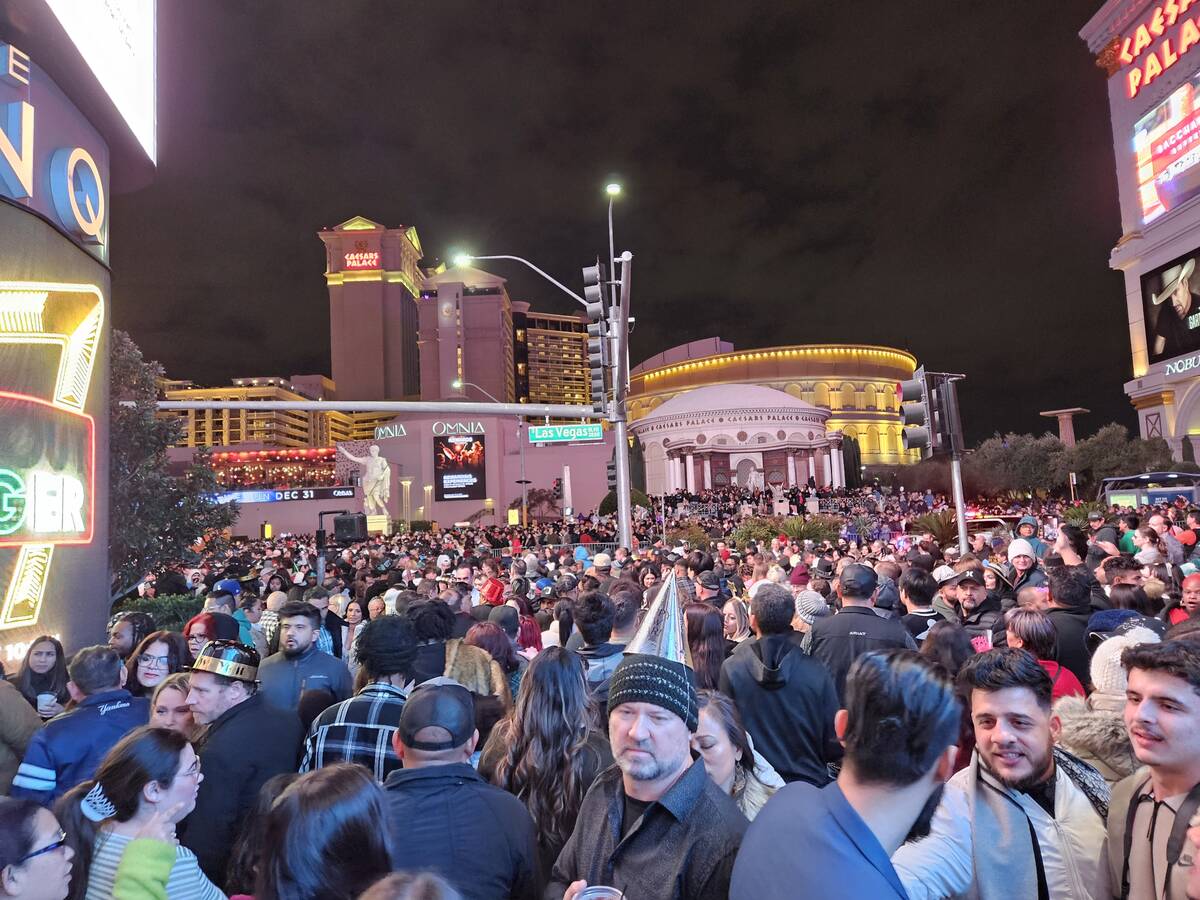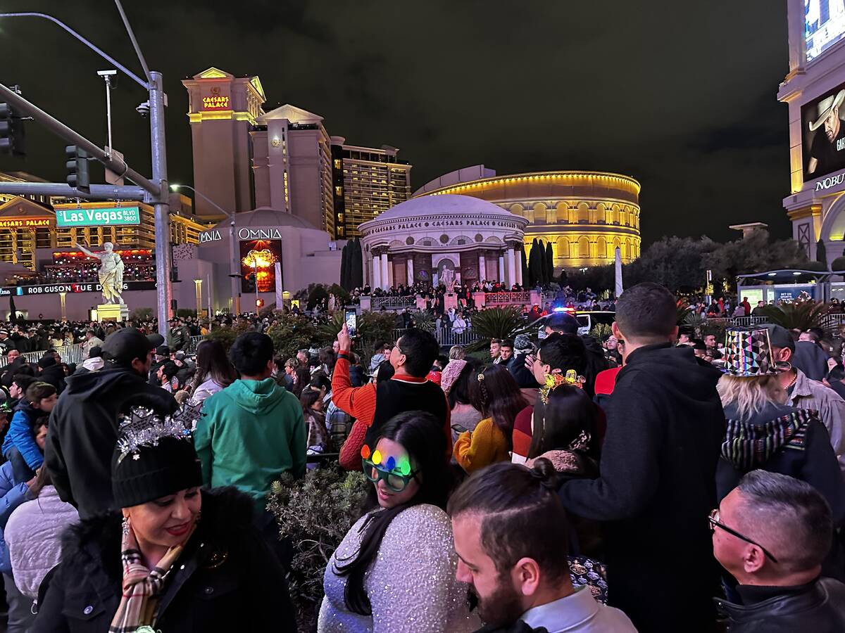 Portions of the Strip, such as sidewalks and road near Caesars Palace, have become challenging to navigate as revelers bunch up in anticipation for the midnight fireworks.