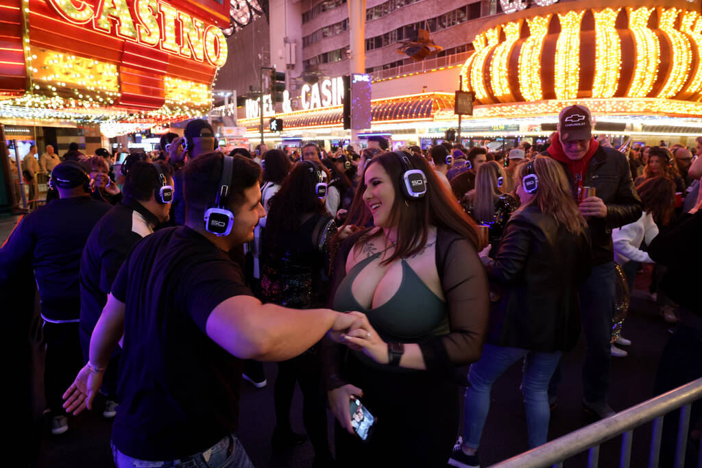 Dozens of people have headphones on and are dancing at a “silent disco” at the Fremont Street Experience’s Casino Center Stage.