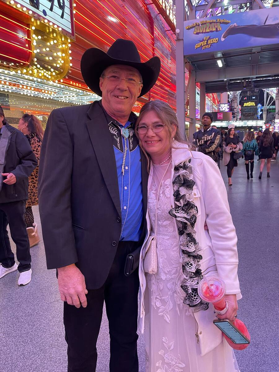Newlyweds Travis and Teresa Carmicheal from Redding, California, were waiting before the Fremont Street Experience opened. Just three hours earlier, they got married at Lucky Little Wedding Chapel.
