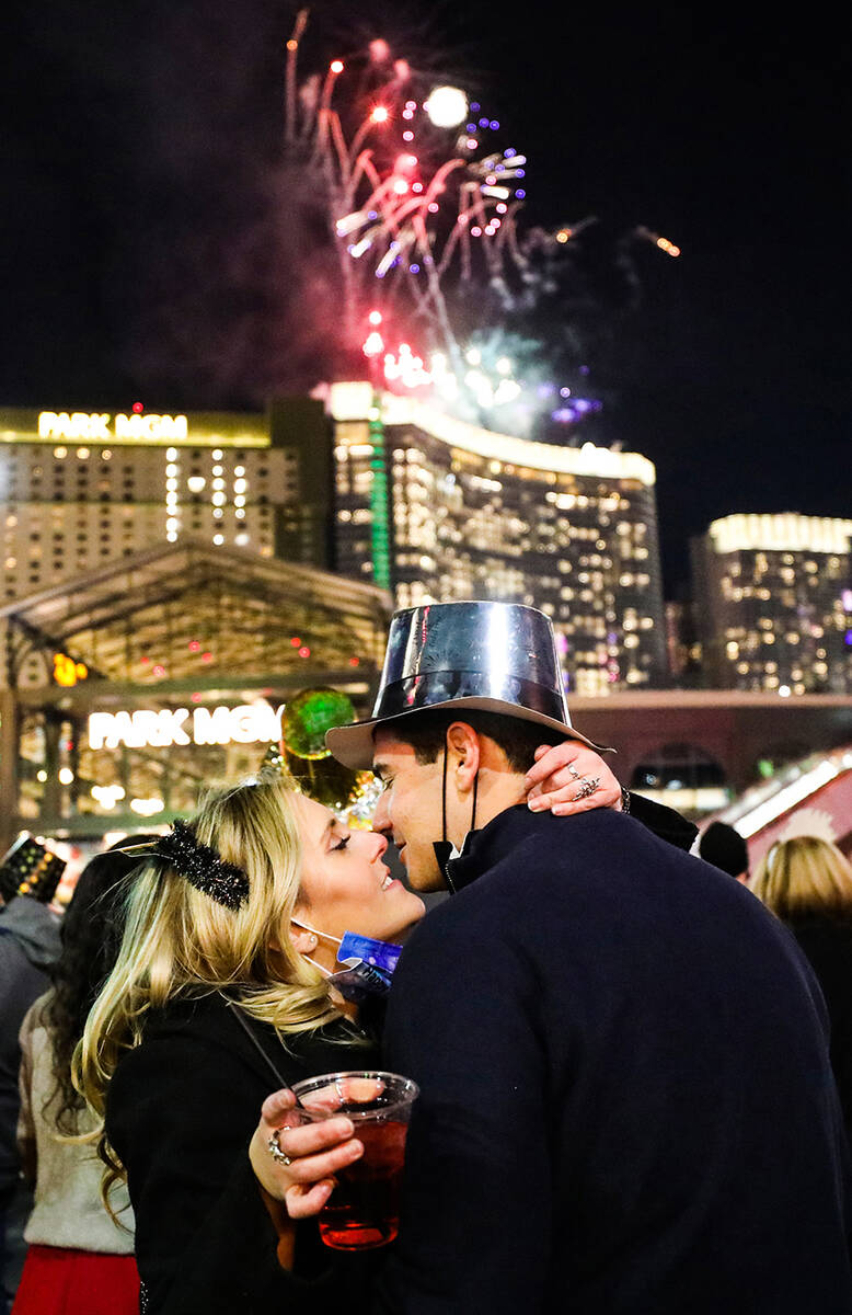 Husband and wife Jake and Paula Yegen locked lips as the fireworks started to cheers in front of the MGM Grand.