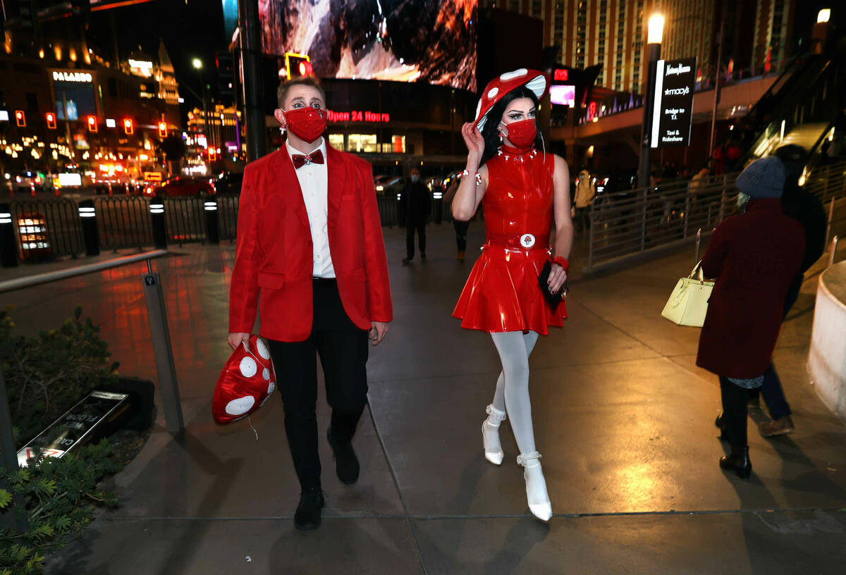 Gared and Anna Aguilar, of Las Vegas, stood between stages at the Fremont Street Experience decked out in ’80s and ’90s costumes. Gared Aguilar dressed as Tommy Chong with a bushy fake beard covering most of his face.