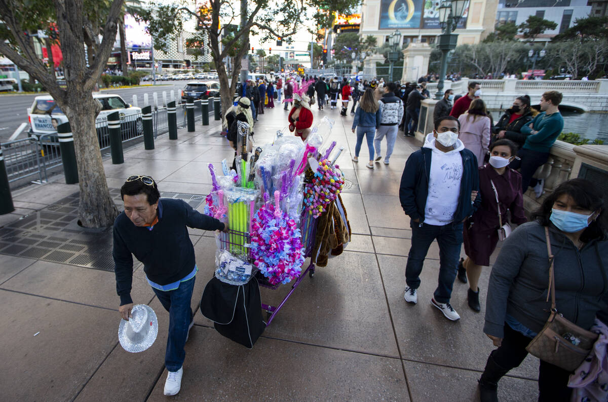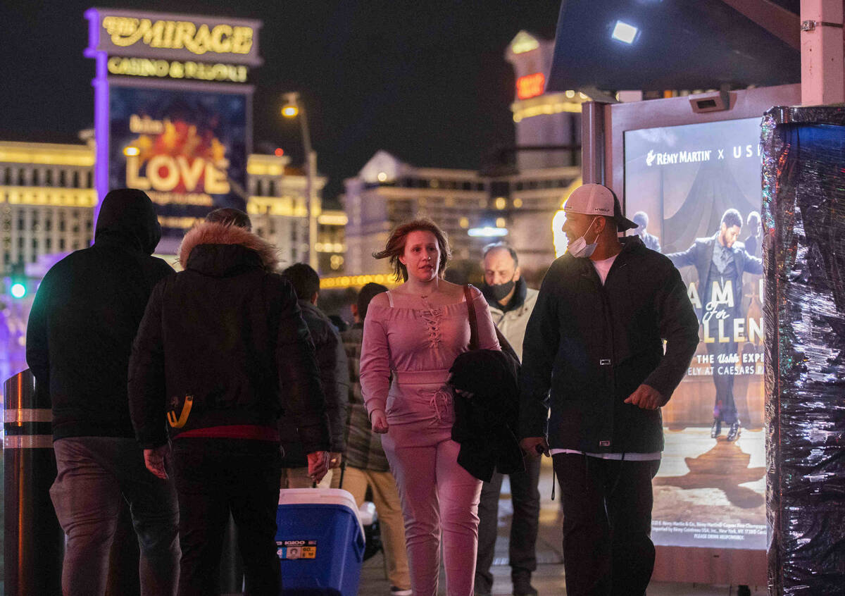 Heavy winter coats covered sequined dresses and suit jackets as crowds of people walked down the sidewalk, stopping only briefly to take pictures with showgirls or shoot video of the Mirage’s volcano. Strong gusts of wind blew water droplets from the display across the street as people hurried to escape the cold.