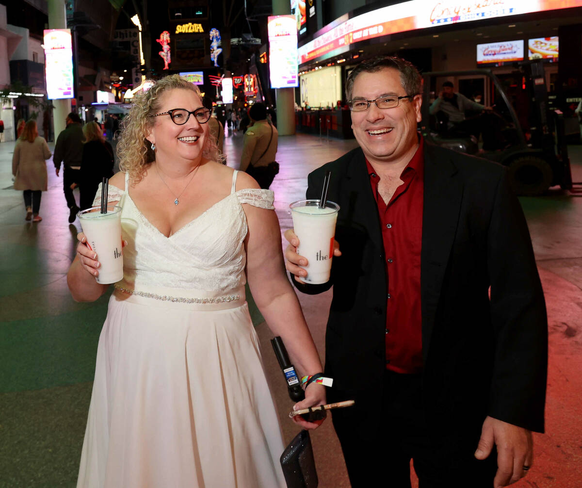 Stephanie and David Kereluk planned to come to Las Vegas to get married on New Year’s Eve, and at 12:31 p.m. today, they did just that. Stephanie Kereluk was still in her wedding dress and ready for a fun post-wedding celebration at the Fremont Street Experience.
