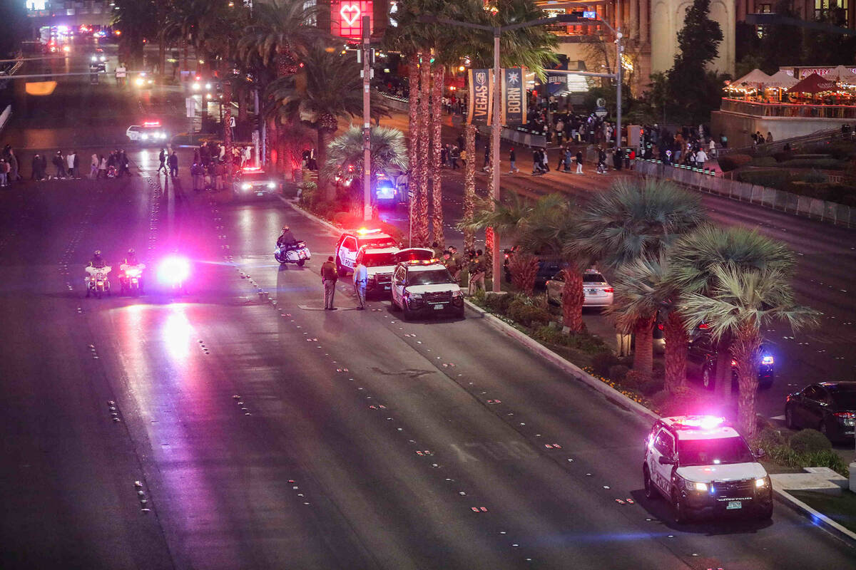 Las Vegas police began breaking down barricades on the Strip and kicking revelers off the roadway.