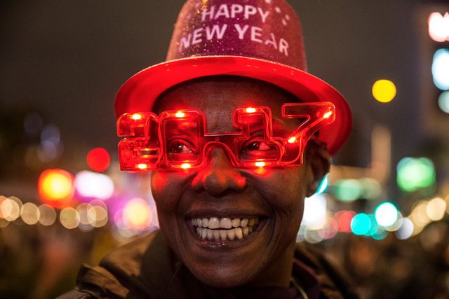 Fireworks go off as New Year’s Eve revelers celebrate on the Las Vegas Strip on Sunday, Jan. 1, 2017. (Chase Stevens/Las Vegas Review-Journal) @csstevensphoto