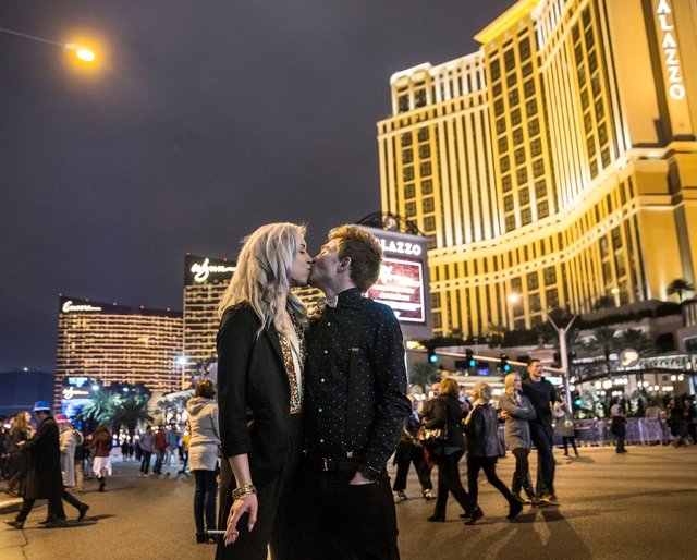 Kiya Daly kisses Zack Rozelle on Las Vegas Boulevard outside the Palazzo hotel-casino on New Year’s Eve (Benjamin Hager/ Las Vegas Review-Journal)