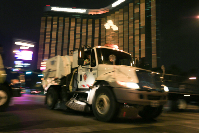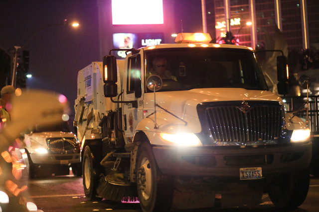 Eighty to 90 employees worked in a street-sweeping cleanup crew to tidy up Las Vegas Boulevard and nearby streets after New Year’s celebrations Sunday morning. They whisked away debris on Las Vegas Boulevard between Mandalay Bay Road and Sahara Avenue.