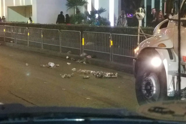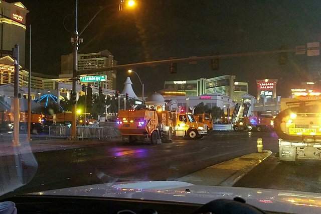 County spokesman Dan Kulin said 26 street sweepers were in action Sunday morning on the Strip — half with Clark County and half with the Nevada Department of Transportation. They worked to remove an estimated 12 to 15 tons of litter from the Strip. Kulin said the effort would cost Public Works between $135,000 and $180,000.